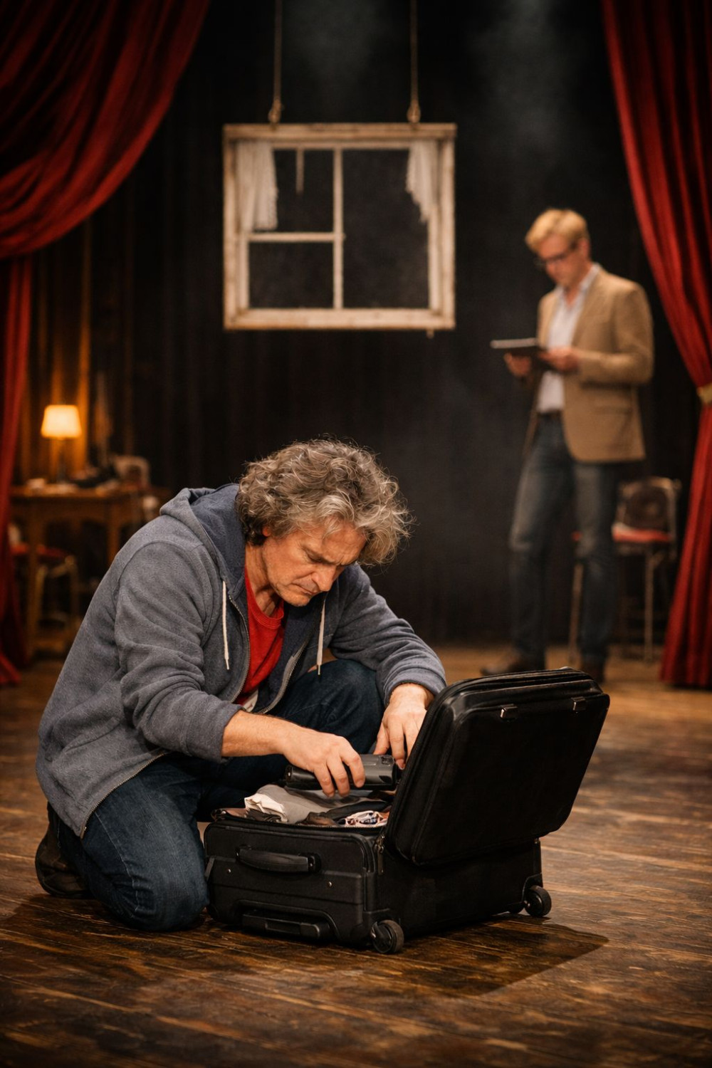 (Das Zimmer ist ein Schlachtfeld. Ein moderner Rollkoffer liegt wie ein aufgeschlitztes Ungetüm auf dem Boden. LUDWIG wühlt mit einer Intensität darin, als gälte es, eine widerspenstige Partitur zu bändigen. JOHANNES lehnt am Fenster, das Tablet in der Hand, den Blick zwischen der Leinwand und seinem Gast wechselnd.)