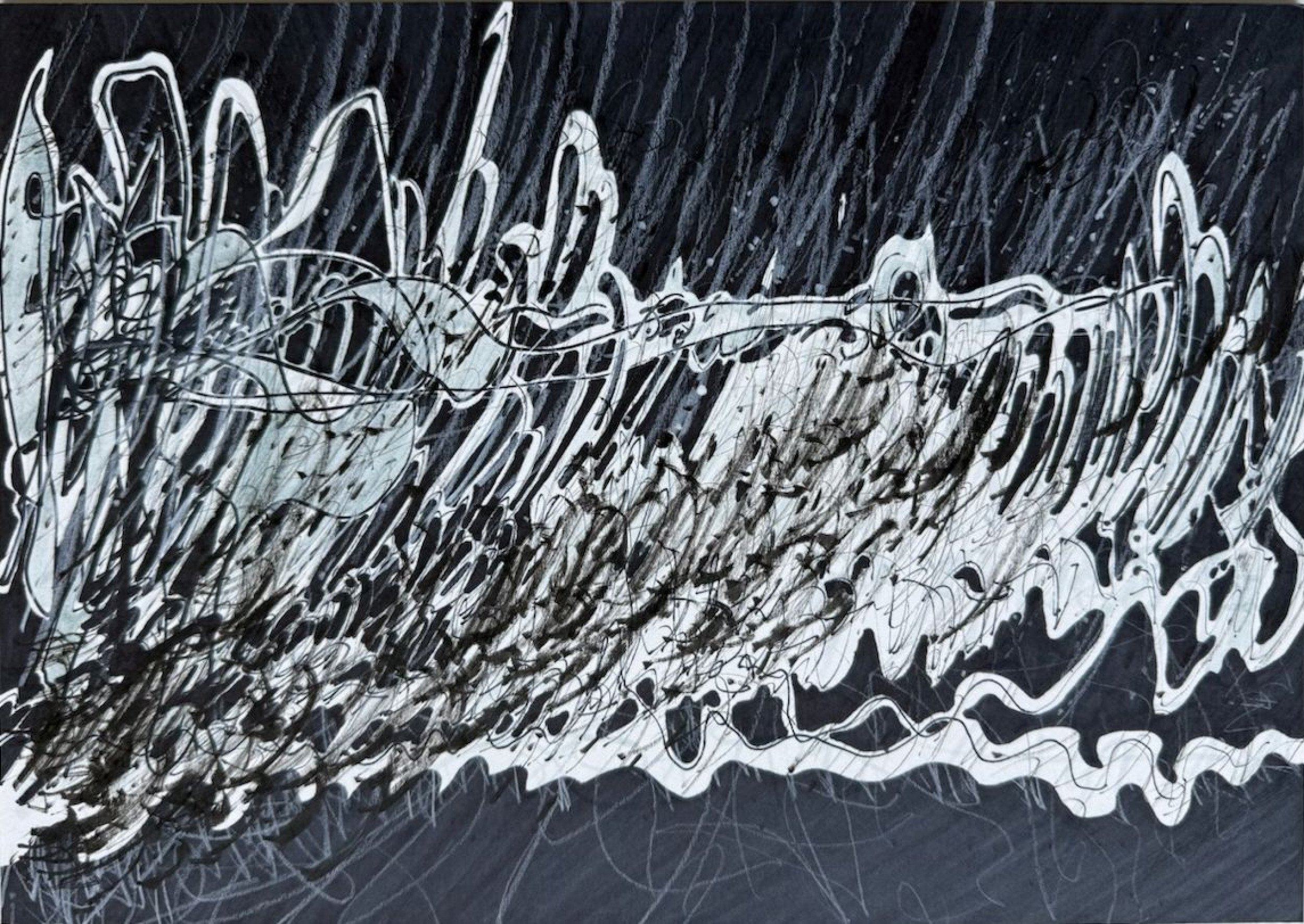 Zwischenzeitlich telefonierte ich mit Anne Barth (Berlin) und erzählte ihr, wie sehr ich den Klang meiner Zeichenstifte auf dem Papier mag. Sie schlug vor, das bei der nächsten Zeichnung aufzunehmen, während ich Musik über Kopfhörer höre. Also hörte ich Kais Loop, klebte das Zeichenpapier fest, um beidhändig zu zeichnen, und nahm den Stiftklang mit dem Handy auf. Ich schickte Kai die reine Aufnahme, die entstandene Zeichnung und später die weiter bearbeitete Version. Nun warte ich gespannt auf seine nächste „Übersetzung“ – ein Dialog, der solange andauert, wie er uns erfüllt.